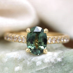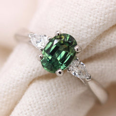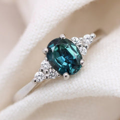 Teal sapphire is a precious gemstone that has truly captured the hearts of millennials and Gen Z alike. Its unique blend of vibrant blue and green hues, reminiscent of aqua, peacock feathers, ocean waves and lush forests, make it a beloved favourite among nature-lovers. The trendiest designs feature trefoil or leafy details on the band, adding an organic touch to any outfit.