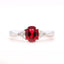 An 18ct white gold ring featuring a vibrant red oval-cut spinel framed by two delicate and sparkling trillion-cut diamonds. This ring can be resized on request.
