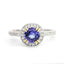 Introducing our Tanzanite Halo Engagement Ring, a blend of vintage elegance and modern craftsmanship. The deep blue tanzanite is framed by a halo of sparkling diamonds, set on a two-tone metal band with diamonds along the sides. Securely held by double claws, the ring features Art Deco-inspired scroll details and delicate engraving on the band, making it a timeless symbol of love and sophistication.