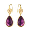 A pair of 18ct yellow gold drop earrings featuring pear shaped cabochon amethysts suspended from trillion shaped yellow diamond slices.