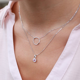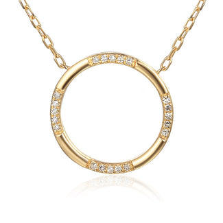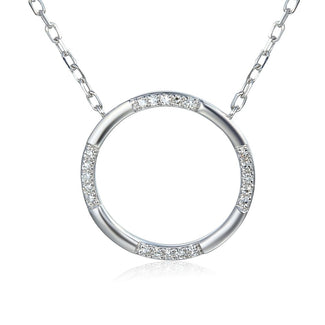 Modern and stylish micro set circle necklace in 18ct white or yellow gold, complemented by a delicate chain.