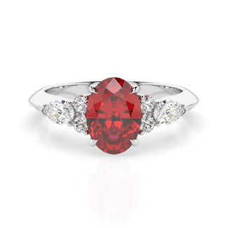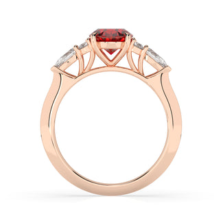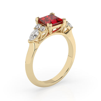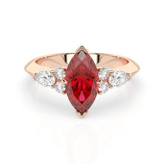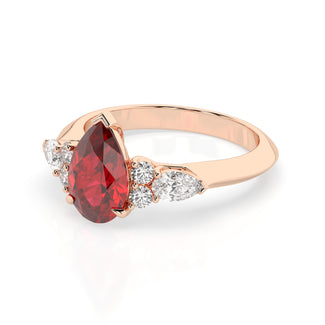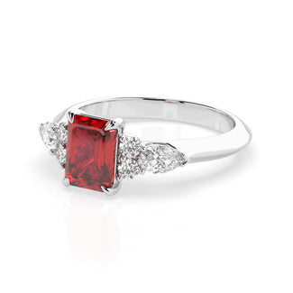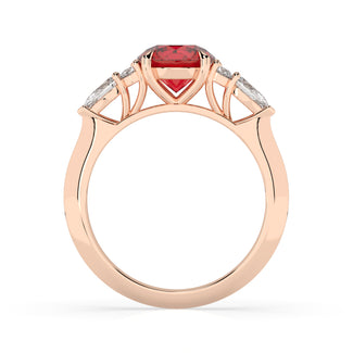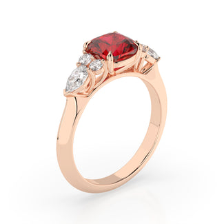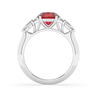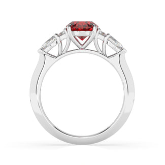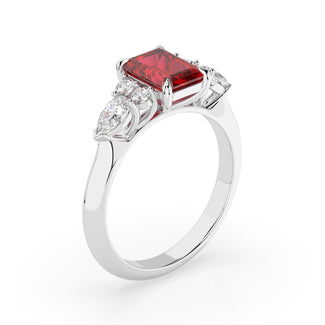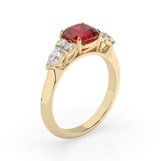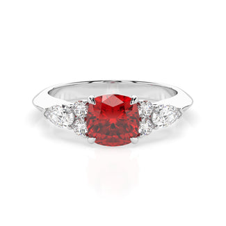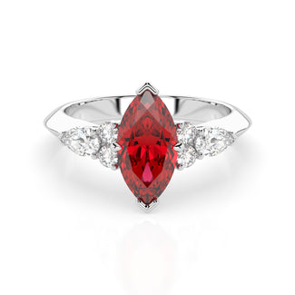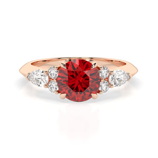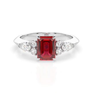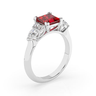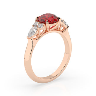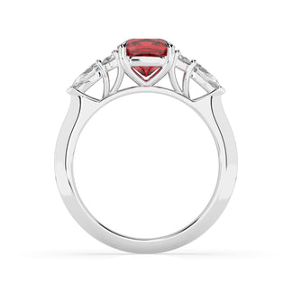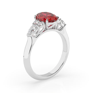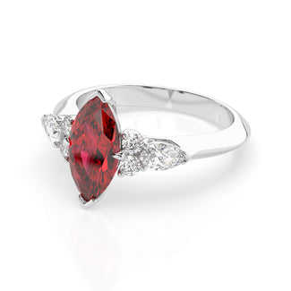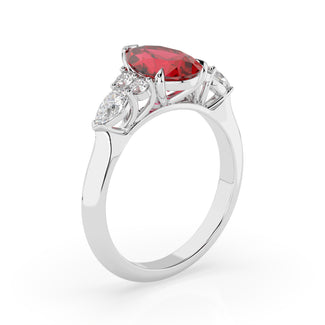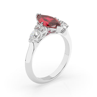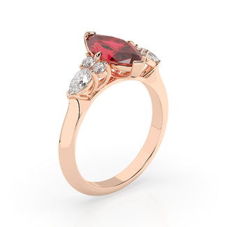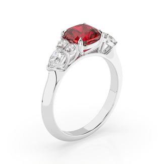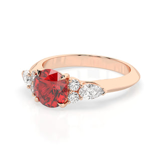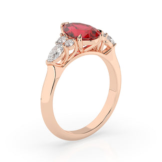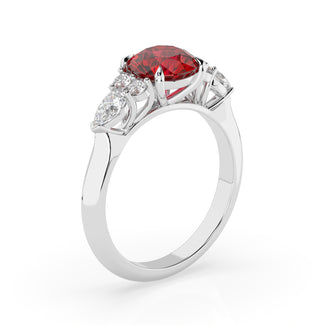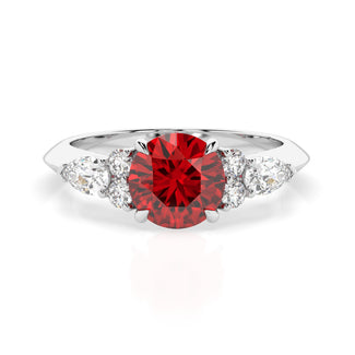 Celebrate your love story with the Amore Ruby Trefoil Engagement Ring—an exquisite symbol of elegance and devotion. This expertly crafted piece features a radiant trefoil design with two brilliant round diamonds flanking a striking pear-shaped diamond, all centred around a captivating ruby. The meticulous arrangement of stones captures and reflects light, creating a breathtaking sparkle that is both contemporary and timeless.