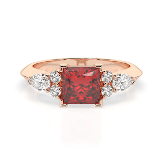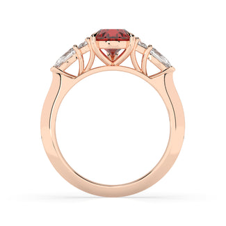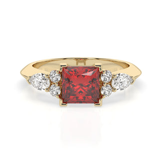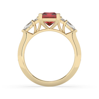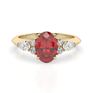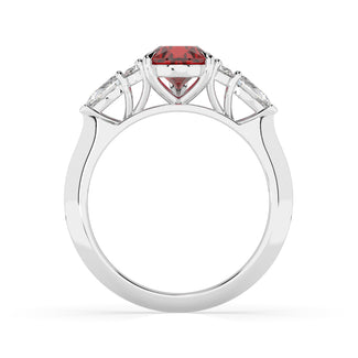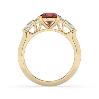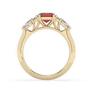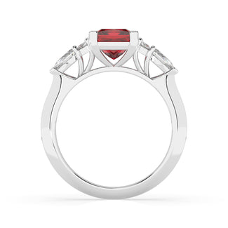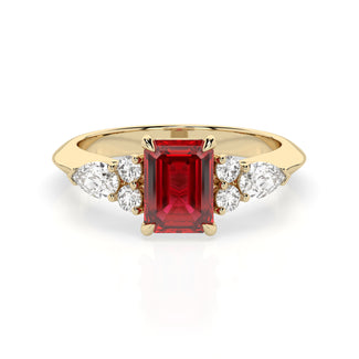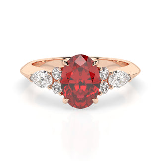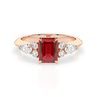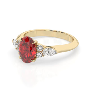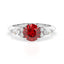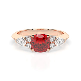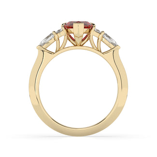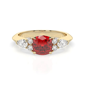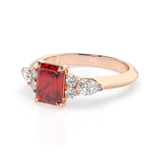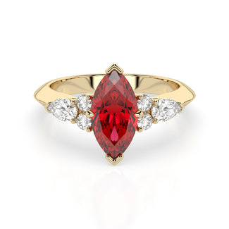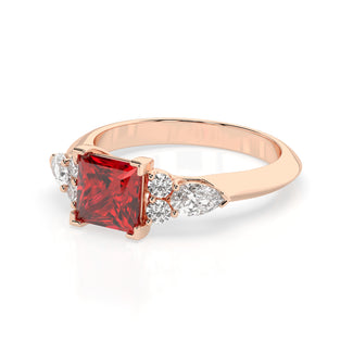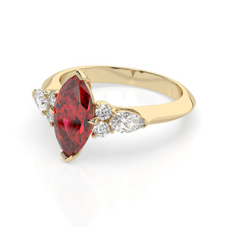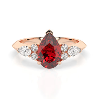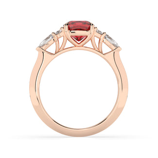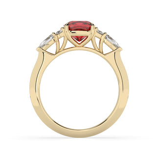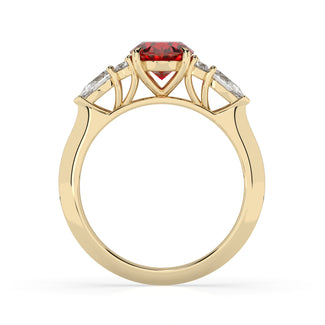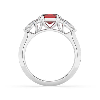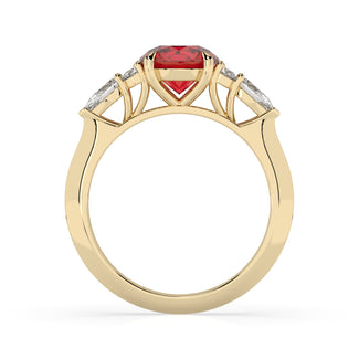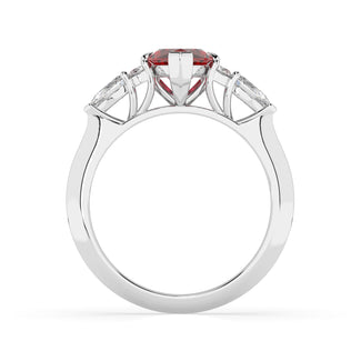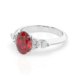 Celebrate your love story with the Amore Ruby Trefoil Engagement Ring—an exquisite symbol of elegance and devotion. This expertly crafted piece features a radiant trefoil design with two brilliant round diamonds flanking a striking pear-shaped diamond, all centred around a captivating ruby. The meticulous arrangement of stones captures and reflects light, creating a breathtaking sparkle that is both contemporary and timeless.